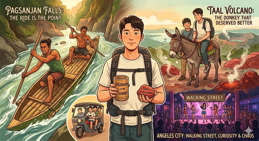 Classes finished. Two roommates, a few days to kill before our flights, and one last trip on the list: Angeles City. Long-distance bus out, then the three of us crammed into a tricycle — a vehicle comfortably built for one, maybe two — for the final stretch to Walking Street.